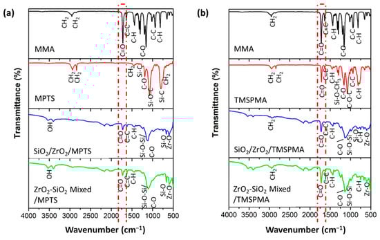 Figure 9a shows that the SiO2/ZrO2 composite with the MPTS surfactant did not show a strong bond, as shown by the weak peaks of the MPTS functional groups in the composite. The peaks represent that the TMSPMA surfactant had a stronger bond with the MMA matrix than MPTS for both composites with different fillers (SiO2/ZrO2 and ZrO2-SiO2 mixed). The strong C = O bond at 1723.03 cm−1 (dashed red box) for the composite with the TMSPMA surfactant is considered to be responsible for a strong filler–MMA matrix. The C = O asymmetric stretch is a characteristic of methacrylate formed in both composites. Other functional groups at 1205.44 cm−1 were assigned to Si-O-CH3 (Si-O bending). The wavenumber range for common functional groups in Figure 9 is summarized in Table 3.