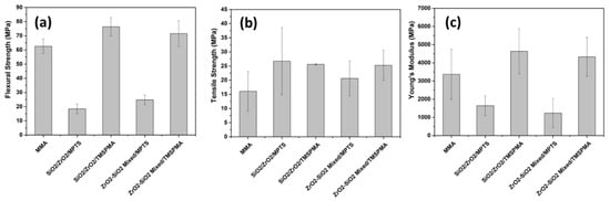 Each sample was measured five times for flexural, DTS, and modulus of elasticity. Based on the results of mechanical tests on several samples, SiO2/ZrO2/ TMSPMA was better than the other samples seen from the flexural, DTS, and ME tests, with flexural values of 152.7 ± 13.0 MPa, DTS with values of 51.2 ± 0.6 MPa and ME of 9272.8 ± 2481.4 MPa (Figure 10). However, the mechanical properties of the composites obtained from MMA with MPTS were even lower than those of the MMA matrix without filler. This shows that MPTS is unsuitable as the MMA surfactant in the two fillers used. In contrast, the composite with TMSPMA showed enhanced mechanical properties compared to the composite with MPTS in both types of fillers (SiO2/ZrO2 and ZrO2-SiO2 mixed). It was highlighted that the composite with TMSPMA using SiO2/ZrO2 filler possessed higher mechanical properties than ZrO2-SiO2 mixed. The size and size distribution of SiO2/ZrO2 particles were lower compared to ZrO2-SiO2 mixed and so considered responsible for the strong bonding between the filler and matrix, causing stronger mechanical properties.