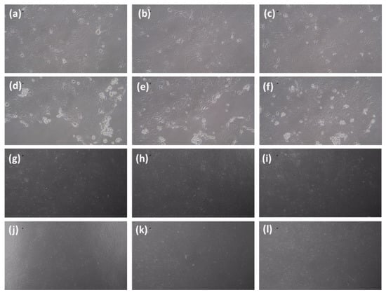 The selected composite of SiO2/ZrO2/ TMSPMA with enhanced mechanical properties was subjected to a toxicity test as one of the essential composite criteria as an endodontic post or implant. Figure 11 shows a microscopic image of 3T3-L1 Fibroblast cells with control (a, b, c) and SiO2/ZrO2/TMSPMA post composite (d, e, f), incubation period of 1 day (g, h, i), incubation period of 4 days, and (j, k, l) 7 days incubation period. Based on the microscopic images, the viability of the living cell can be determined when the cell nucleus absorbs the blue color from trypan blue, according to the procedure carried out by Strober W, 2015 [36]. The cell is considered a living cell when it does not absorb the trypan blue color, the cell periphery glows, and the shape is perfectly round. On the other hand, the cell is considered to be dead when it is not perfectly round, and the cell wall is destroyed.