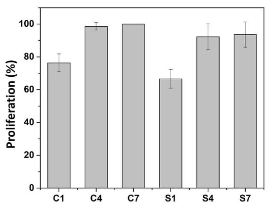 Figure 12 shows that the percentage of live cells (treated with control, C1, C4, and C7) on the first day of incubation (S1) was 87.06%, on the fourth day of incubation (S4) was 93.38%, and on the seventh day of incubation (S7) was 93.61%. The cytotoxicity level of each concentration of antibacterial agent was calculated as a percentage of cell viability, including absorbance values obtained for each system. According to ISO 10993-5, the percentage of cell viability was above 80%. Thus, it is considered non-cytotoxic based on the criteria that within 60–80% is weak, 40–60% moderate cytotoxicity, and below 40% severe cytotoxicity [41,42].