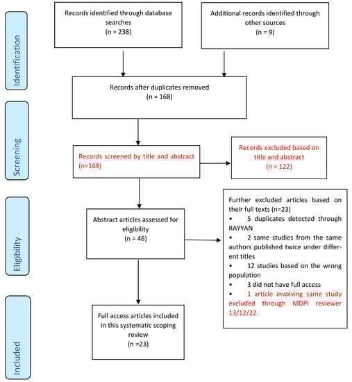 - Munn, Z.; Peters, M.D.; Stern, C.; Tufanaru, C.; McArthur, A.; Aromataris, E. Systematic review or scoping review? Guidance for authors when choosing between a systematic or scoping review approach. BMC Med. Res. Methodol. 2018, 18, 143. [Google Scholar] [CrossRef]