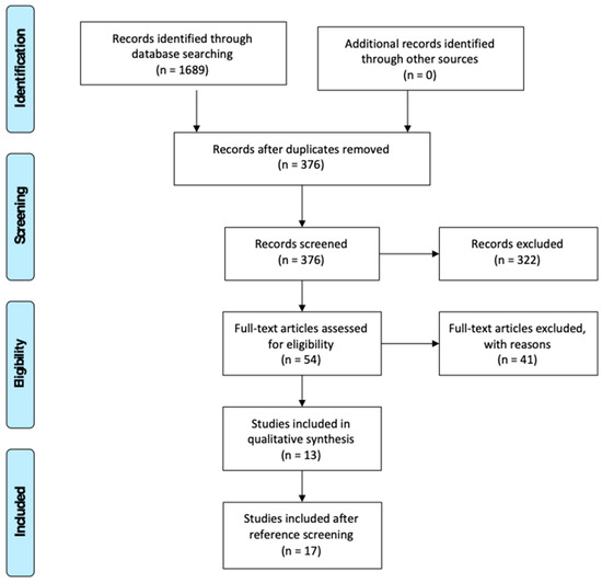 The database searches identified 1689 records. Once duplicates were removed, there were 376 records (Figure 2). The identified 376 papers were screened for exclusion by title. 195 studies were excluded. Then, 181 papers were screened by abstract, of which 55 were included. Sixteen non-English articles that did not have a translated version were excluded at this stage.