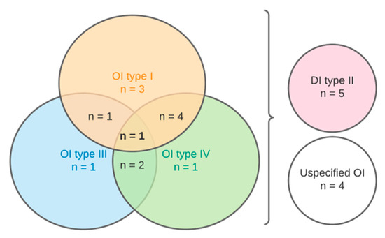 For the purpose of facilitating the result analysis, the 17 included articles (Table 3) were divided based on the type of osteogenesis imperfecta. Nine papers studied DI affected teeth in patients of type I OI, eight papers examined type IV OI and DI and five studies looked at type III OI and DI. Four papers did not classify the type of OI for samples. As there was an overlap between studies, a Venn diagram was used to clarify the duplicate number of articles, as shown in Figure 3.