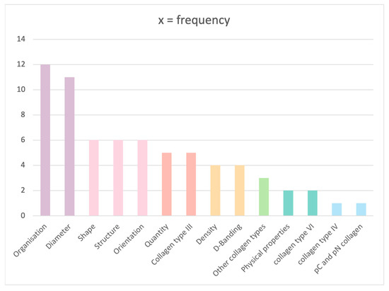 The most frequent criteria used for assessment were fibrils organisation and collagen diameter, accounting for approximately 70% (12/17) and 65% (11/17) of the studies, respectively. Fibre shape, structure and orientation were described by 35% (6/17) of the papers, followed by 29% of the studies (5/17) covering fibre quantity and presence of collagen type III. Other less commonly used parameters were collagen density, cross-banding, physical properties such as dentin hardness and elasticity and presence of other types of collagen. Second to collagen type I, collagen type III was more commonly tested in studies than types VI and IV, accounting for n = 5 vs. 2 and 1, respectively (Figure 4).