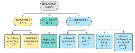 Categorisation of studies reporting on collagen organisation by DI and OI types.