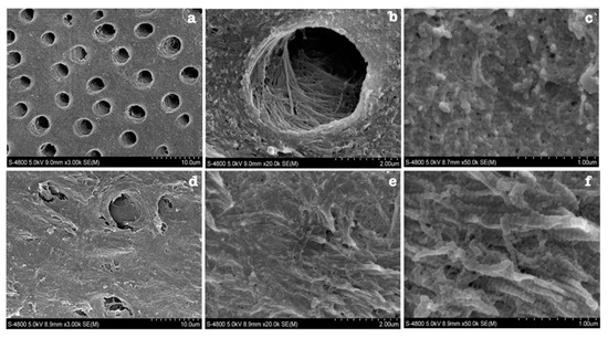 SEM image of normal dentin (a–c) and OIDI dentin (d–f). (a,b) control dentin has regular dentinal tubules and (c) has highly mineralised and organised collagen fibres. (d) Defective dentin occluded dentinal tubules (e,f) irregular organisation of exposed collagen fibres [33].