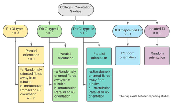 Six studies reported on collagen fibres orientation in DI affected teeth (Figure 11). Four papers reported on primary teeth yet only three specified the number of teeth, n = 18 [25,26,28,37]. One study reported on both dentitions without sample size specifications and another did not declare any information on study sample. One paper examined DI teeth in subjects affected by types I, III and IV OI, all of which had comparable fibres orientation. The direction of orientation differed according to proximity to the dentinal tubules. Intratubular fibres were found mostly parallel to the long axis of the tubule, while in sections away from dentinal tubules fibres were in random orientations [26]. Occasional parallel orientation was also found in DI teeth affected by OI type III [23]. This was also reported by a study that examined type I OIDI affected teeth, with the addition of 45° orientation of some intratubular fibres [25]. One study reported a unidirectional parallel fibre orientation in types I and IV OI-DI teeth [37]. In contrast, a more recent study found that the orientation of collagen fibres is mostly disoriented and haphazard [28]. This was also the finding of a study that examined teeth of isolated DI type II; collagen fibres did not follow a specific orientation and were mostly aberrant [35].