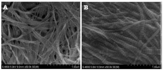 SEM of collagen fibres. Normal and intact fibres with normal banding periodicity in control dentin (A). DI dentin collagen fibres have variable and wide banding periodicity (B) [33].