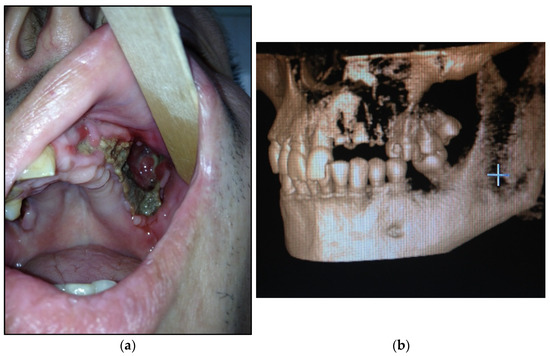 Figure 1. (a) Patient with type 1 toxic phosphorus osteonecrosis. Intraoral view; (b) CT-scan of patient’s skull.