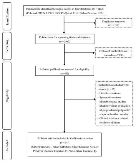This review was prepared according to the PRISMA checklist for scoping reviews [25]. An extensive search was performed using the search terms “(silver) AND (dental pulp OR pulp)” in four databases (ProQuest, PubMed, SCOPUS, and Web of Science). The included studies were limited to articles published in English on or before 1 November 2022. Duplicate articles; clinical, in vivo, or in vitro studies not related to silver-containing materials; abstracts; conference papers; literature reviews; and systematic reviews were excluded. For a study to be included, it had to evaluate the pulpal response (clinical, in vivo, and ex vivo) or the cell’s pulpal response (in vitro) to silver-containing materials used as cavity conditioners. Two authors participated in the study selection process (A.Z. & O.Y.Y.), and in case of a disagreement, they referred to a third author (C.-H.C.). Important information was collected on separate spreadsheets by the investigators. All the reference lists of the included studies were checked for potential studies. The study selection process is presented in the flow diagram below (Figure 1). A summary of all the included studies can be found in Table 1.