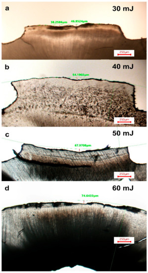 Non-decalcified samples were embedded into transparent resin (Epofix, Struers, Denmark), then cut transversally at a thickness of 100 μm using IsoMet 2000 (Buehler, Ltd., Lake Bluff, IL, USA), polished with 600 grit silicon papers (Matador, Germany), and then observed with a transmitted light microscope (AmScope ME580TA-PZ-2L-16M3, Irvine, CA, USA) at 40× magnifications. Samples were photographed with a digital camera with 16 megapixels (AmScope MU1603, Irvine, CA, USA). The depth of the ablated area between existing grooves was evaluated and calculated. To re-establish the original design of the root, a line was drawn starting from the highest points inside the longitudinal groove delimitation, using the 3-points circle measurement tool in AmScope software version x64, 4.11 (AmScope, Irvine, CA, USA). Two points of the mentioned tool were chosen on each side of the irradiated area, while the 3rd point was used to determine the curvature of the line. The ablation of cementum was measured using vertical line measurement tool within the same AmScope software from the newly drawn line to the deepest ablated area. When several depths appeared in the same crater (sample), multiple measurements were conducted. A mean value of the depth was then calculated per sample; then, mean and standard deviation were calculated per group.