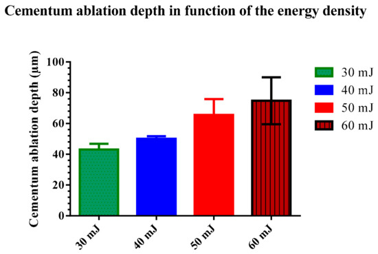The lowest cementum ablation depth appears at low energy irradiation of 30 mJ (Figure 3). The more the energy increases, the more the cementum ablation is visible. At the energy level of 60 mJ, we were able to see in few samples a total elimination of the cementum.