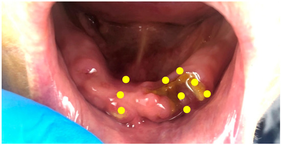 Clinical aspect of the mandibular arch immediately after the 3rd session of photobiomodulation therapy. The schematic yellow spots represent the areas of irradiation made in each of the nine sessions.