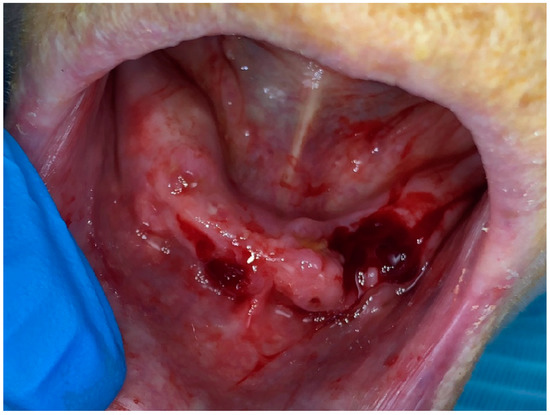 After one week of the third session of photobiomodulation therapy, a minimal surgical intervention was performed at the exposure sites of the mandible. The surgical intervention was performed under local anesthesia and consisted of an excision of the necrotic bone using a sterile manual bone curette (HSI 100-4643 Bone Curette, Henry Schein Dental, Queens, New York City, NY, USA) followed by the use of a sterile round carbide burr mounted on a high-speed turbine. The excision was considered completed when bleeding from the bone started to appear, which suggests that a sound and living bone was reached. At this stage, a small incision of one millimeter was made on the gingival tissue surrounding the exposed bone in order to provoke bleeding. The blood was coagulated with a 980 nm diode laser (Smart M, Lasotronix, Warsaw, Poland) with the following parameters: a tip diameter of 200 μm (µm); a power of two watts, a continuous contact mode; an irradiation time of 20 s; a total energy density of 40 J/cm2. After treatment, the patient was asked not to rinse nor to brush this area for twenty-four hours. She was instructed to use chlorhexidine 0.12% mouthwash (Eludril Pro, Pierre Fabre, Castres, Midi-Pyrénées, France) after twenty-four hours of the intervention and asked to come in the next day for another session of photobiomodulation therapy (Figure 3). The same instructions were given to her daughter who was accompanying her in order to ensure the patient would follow the instructions at home. Moreover, the patient and her daughter were educated about the at-home management of MRONJ; the education was created based on the recommendations of the American Association of Oral and Maxillofacial Surgeons (AAOMS). It is also important to mention that no antibiotic medication was given to the patient and that no suturing was performed after treatment; rather, the blood coagulated and was left.