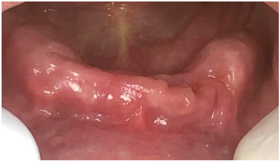 Follow-ups were conducted at twenty-four days and at three months following the last session of photobiomodulation therapy. At twenty-four days, the patient presented a healed mucosa with no signs of infection and a complete absence of any exposed bone (Figure 4). The patient scored 2/10 on the visual analogue scale and reported satisfaction with the overall results, with an absence of pain and a significant improvement in swallowing ability and overall quality of life. At three months post-operation, the patient scored two out of 10 again on the VAS and reported to be satisfied with an overall significant improvement in the quality of life. Moreover, the clinical aspect was similar of that seen at 24 days after surgery.