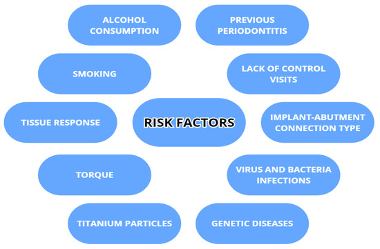 | 4 [24] | Astolfi V. et al. | International Journal of Environmental Research and Public Health | 2022 | Article | Smoking, lack of regular follow-up visits and previous periodontal problems increase the chance of peri-implantitis, external abutment connection increases the risk of peri-implantitis |
