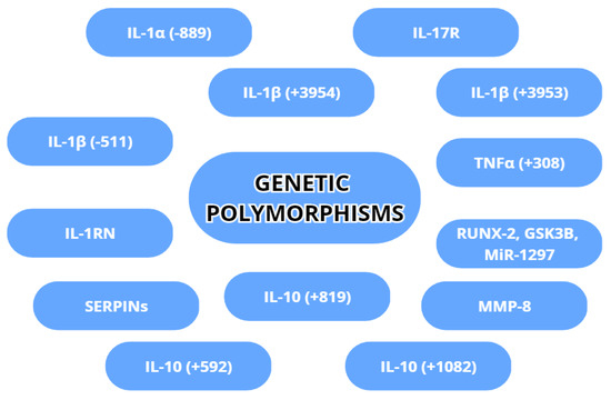 | 12 [32] | Corrêa M. et al. | Brazilian Oral Research | 2019 | Review | In peri-implantitis there are elevated levels of IL-1β, TNFα, IL-8, IL-17, IL-23, MMP-1, MMP-8, RANKL and decreased levels of PPARγ, IL-10, TIMP-1, OPG, BMP-7, RUNX, IL-1RA. Furthermore, the polymorphisms of IL-1β (−511), MMP-1 (G-1607GG), TNFα (308) may increase the risk of peri-implantitis. TNFα and IL-1β can have diagnostic potential. |