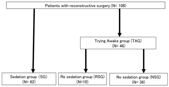 Dexmethidine was used for both the SG and TAG patients to sustain postoperative rest. The SG was managed with deep sedation using propofol, and respiratory depression was managed with a respirator. TAG patients who developed symptoms such as excitement and delirium were not able to sufficiently rest and received sedative management in the HCU, ICU, or operating room and were further defined as the RSG. All cases were targeted to maintain a Richmond Agitation Sedation Scale (RASS) score of 0 to 2 until the postoperative period.