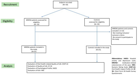 To answer the research question, the primary aim of this study was to conduct an exploratory analysis of the OHRQoL, QoL, and psychological profile, in particular anxiety and depression, of MRONJ patients in comparison to a group of controls matched by gender and age. Finally, the secondary aim was to analyze the correlation between the OHRQoL and QoL with the psychological profile in MRONJ patients.