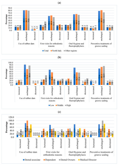Preventive treatments of groove sealing remained unchanged for 78.5% (n = 1376) of dentists. This percentage was confirmed among dentists in the North (81.5%). In comparison, approximately 16% and 11.1% of dentists in the other regions reported a decrease and increase in these treatments (Figure 1a), respectively. Details about dental treatments, based on dentists’ experience or working position, are reported in Figure 1b,c.