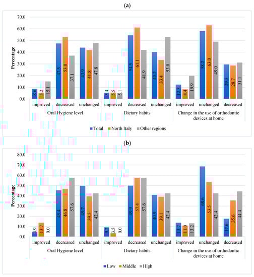 For 55% (n = 954) dentists, good dietary habits decreased during the pandemic. This decrease was mainly observed by dentists in Northern Italy (61.1%) compared to those in the other regions (41.1%) (Figure 2a).