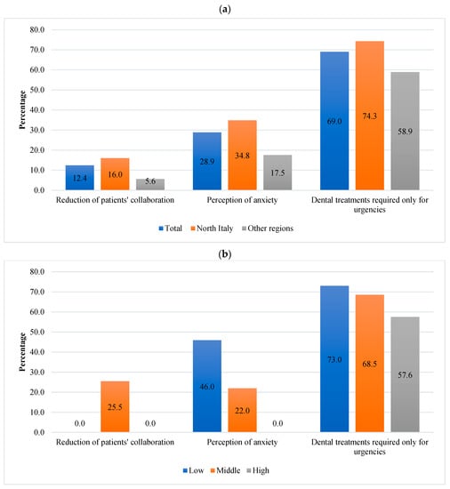 The reduction in patients’ collaboration was reported by only 12.4% of dentists, especially in Northern Italy compared to the other regions and among dentists with moderate experience (Figure 3b).