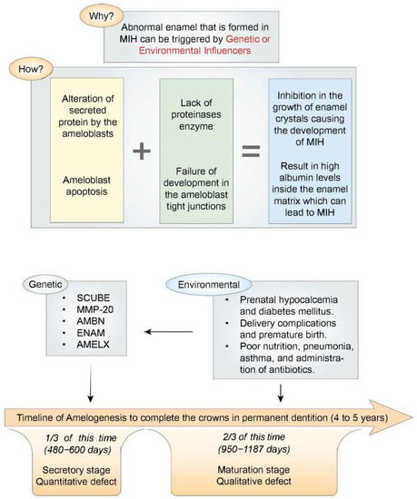 Although the exact cause of MIH remains unclear, a combination of several factors has been proposed to explain the occurrence of this lesion. Potential causes can be divided into genetic and environmental influences [9]. However, before delving into these factors, it is essential to comprehend how this defect develops, and at which stage of enamel formation can MIH occur.