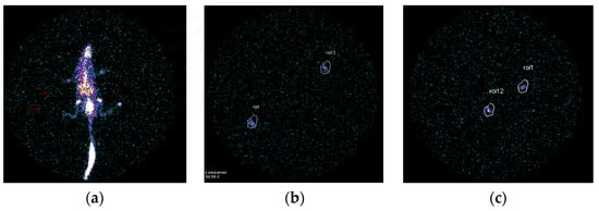 After the experimental period, nuclear medicine images were performed (Figure 1a) and after occision, mandibles were taken, the regions of interest (ROIs) were drawn over each mandible (Figure 1b,c) and the counts per minute were acquired. The results showed an increased uptake of 99mTc-HMDP of 13.08 ± 3.65 counts per minute (cpm) in the ZOL group. In contrast, in the CT group, the uptake was reduced to 11.98 ± 8.75 cpm, although with no statistical difference (p = 0.719) (Figure 2).