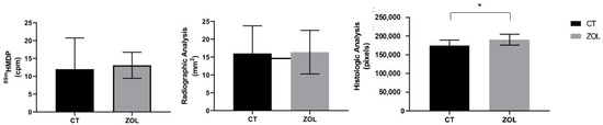 Radiographic, histologic, and nuclear medicine analysis. (Cpm = counts per minute; CT = control group (saline solution); ZOL = zoledronate). Statistical analysis: * p < 0.05.