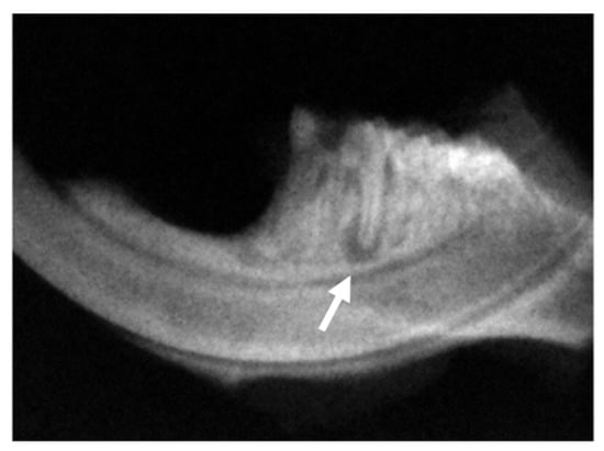 Radiographic images that show radiolucency developed at the apex (arrow) and furcation periodontium of the pulp-exposed tooth of the left mandible. The image is representative from an animal of the control group.