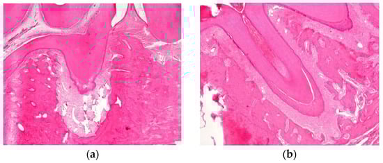 (a) Histological analysis exhibited an increased periodontal ligament with loss of lamina dura and alveolar bone resorption was considerably enlarged in the saline-solution group (190,515 ± 14,355 pixels). Magnification: 40×. (b) Histologic analysis exhibited an increased periodontal ligament with loss of lamina dura and alveolar bone resorption which was reduced in the ZOL group.