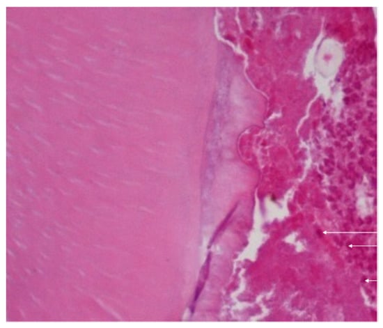 Histological analysis in all groups also exhibited periapical lesions with enlargement of the periodontal space and disorganization of the periodontal ligaments, with large number of macrophages present throughout the periodontal ligament (arrow), and no osteonecrosis was observed. Magnification: 400×.