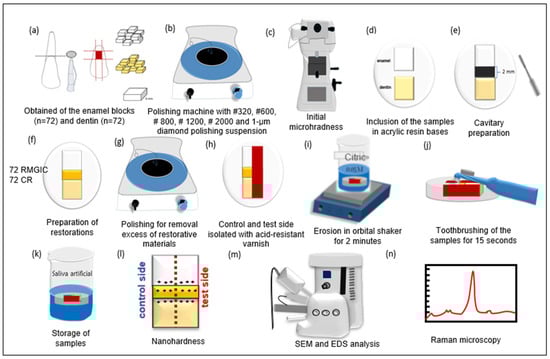 Specimen preparation and study flowchart. (a) A total of 144 bovine incisors were obtained and 72 enamel and 72 dentin blocks were created (4 × 4 mm2). (b) The blocks were then polished in an automatic polishing machine. (c) Blocks were selected using a surface microhardness analysis. (d) Enamel and dentin blocks were inserted into an acrylic base, 1 mm apart in each base. (e) A cavity was prepared on the mesial surfaces of the specimens, with a total surface area of 2 × 2 mm2. (f) The RMGIC or CR restorations were applied. (g) The restorations were polished to remove excess restorative material. (h) The hemiface of each specimen/restoration set was covered with an acid-resistant varnish. (i) The specimens were subjected to erosion (4 times/day) (j) and abrasion (2 times/day) cycles. (k) The specimens were stored in artificial saliva between cycles. (l) The dental substrates and restorative materials were subjected to H analysis. (m) SEM/EDS analyses of the dental surfaces and restorative materials were performed. (n) Raman spectroscopy analyses of the dental surfaces were performed.