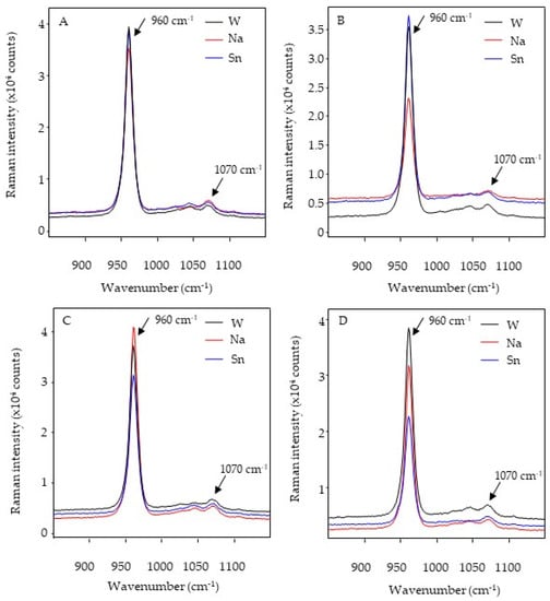 Raman spectroscopy for the control and eroded enamel, with a phosphate peak at 960 cm−1 and carbonate peak at 1070 cm−1. (A) ERMGIC-C, (B) ERMGIC-E, (C) ECR-C, and (D) ECR-E.