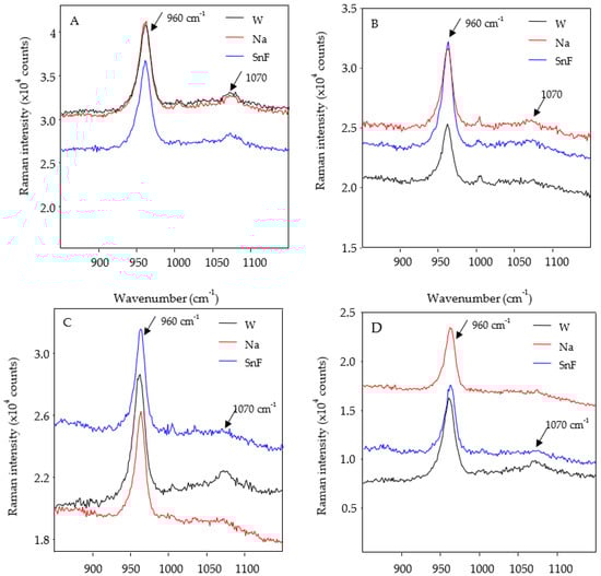 The common peaks and areas detected in both enamel and dentin were phosphate (960 cm−1) and carbonate (1070 cm−1) in the Raman analysis (Figure 2 and Figure 3).