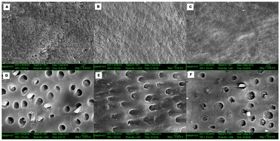 - Basting, R.T.; Leme, A.A.; Bridi, E.C.; Amaral, F.L.; França, F.M.; Turssi, C.P.; Bedran-Russo, A.K. Nanomechanical properties, SEM, and EDS microanalysis of dentin treated with 2.5% titanium tetrafluoride, before and after an erosive challenge. J. Biomed. Mater. Res. Part B Appl. Biomater. 2014, 103, 783–789. [Google Scholar] [CrossRef] [PubMed]