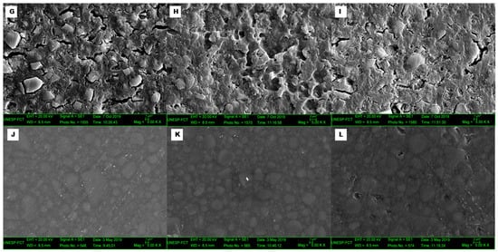 With regard to the restorative materials, ionomeric materials seem to be influenced by the action of fluoride-based toothpastes, as the eroded RMGIC surfaces in the present study showed increased Ca and decreased F levels after brushing with NaF and SnF2. This was probably due to ion exchange with the environment, which may have been associated with the material’s ability to stabilize the pH and simultaneously allow fluoride release into the environment [33]. In addition, NaF and SnF2 resulted in greater alterations on eroded surfaces, which may be consistent with the findings of SEM analyses (Figure 4H,I), which showed greater changes in the material after the erosion–abrasion cycles. In contrast, CR showed a similar composition to Si and Zr (Figure 4J–L) after the erosion–abrasion cycles, corroborating the nanomechanical properties that also remained constant. Guler et al. [36] investigated the effects of beverages with different pH and citric acid levels on various resin-based restorative materials (CR and RMGIC) using atomic force microscopy and SEM analysis. They observed that the ionomeric material presented with deep cracks and spaces between particles, while the CR group showed no significant changes, consistent with the SEM findings in the present study. Fluoride-based toothpastes affected the structural composition of the ionomeric material, as observed on the SEM images (Figure 4H,I). On the other hand, CR showed no changes in the chemical composition or significant morphological surface alterations (Figure 4J–L).
