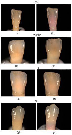 Illustrates an example of coronal discoloration observed at time t0 and t30d for the different groups. (a) NC-t0 (w/o swine’s blood); (b) NC-t30d (w/swine’s blood); (c) WMTAP-t0 (w/o WMTAP, and w/o incubation); (d) WMTAP-t30d (w/WMTAP and 30 days of incubation); (e) BD-t0 (w/o BD, and w/o incubation); (f) BD-t30d (w/BD and 30 days of incubation); (g) TF-t0 (w/o TF and w/o incubation; (h) TF-t30d (w/TF and 30 days of incubation).