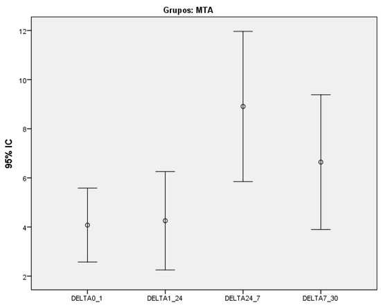 Furthermore, we assessed whether a significant change in discoloration had occurred within each group between the evaluated time intervals. The probabilities of significance are presented in Table 8. Only WMTAP showed a significant difference in discoloration between time intervals (p < 0.037-Friedman test) (Figure 2)