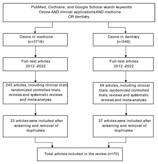 A total of 3718 papers were identified in medicine and 548 papers in dentistry. Full-text articles between 2012 and 2023 were selected, where a total of 245 and 49 articles including clinical trials, randomized controlled trials, reviews, systematic reviews, and meta-analysis were reviewed in medicine and dentistry, respectively. After screening and removal of duplicates, a total of 70 articles (33 and 37 articles in medicine and dentistry, respectively) that described the use of ozone therapy in medicine and dentistry were included in the present review (Figure 1).