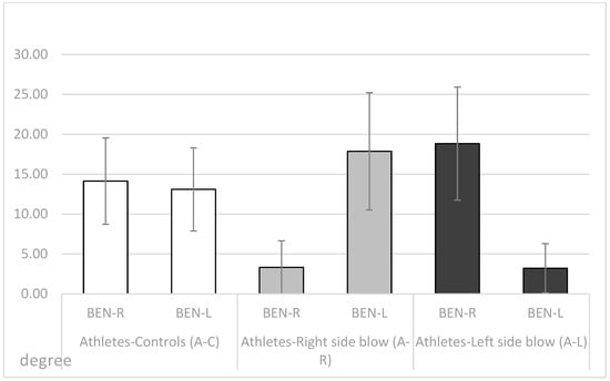 The control group of athletes (A-C) had similar left and right Bennett angles with a very small mean difference (0.52°). The athletes in the group who reported a blow to the right side of the mandible (A-R) had smaller mean values of the Bennett angle of the right condyle (BEN-R) when the condyle movement was to the left. Fourteen of them showed a Bennett angle of the right condyle of 0° and 27 athletes showed an angle of 4°. The measured Bennett angle of the right condyle deviated from the above values only in two of the injured athletes, which were greater than 14°. While their left Bennett angle had much higher values (BEN-L). The athletes in the group (A-L) who reported a blow to the left side of the mandible had smaller Bennett angle mean values of the left condyle (BEN-L) during mediotrusive condylar movement to the right side. Thirteen of them showed a Bennett angle of the left condyle of 0° and 26 athletes showed an angle of 4°. The Bennett angle of the left condyle deviated from the above values only in two of the injured athletes, which were greater than 13°. Similar to the (A-R) group, the (A-L) group also showed higher mean values of Bennett angle on the opposite side of the injury (BEN-R).
