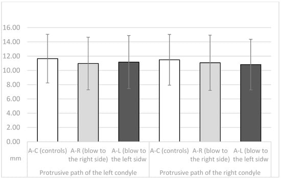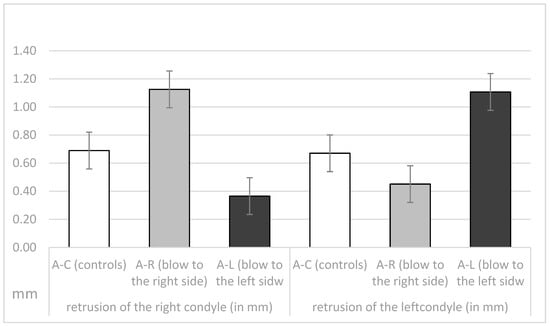 The difference between the right and the left condyle’s retrusive movement in the A-C, the A-R and the A-L groups is presented in Figure 7. The results collected show no significant difference between retrusive movements in the control group, while the studied groups have values of −0.67 and 0.74.