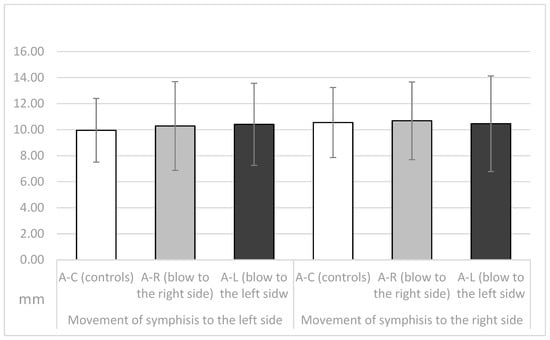 The movements of the symphysis to the left and right sides in the three observed groups are shown in Figure 5. There were no significant differences in symphysis movement to the right side (F = 0.57, p = 0.945) or to the left side (F = 0.278, p = 0.758) between the three observed groups.