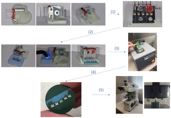 Summary of the randomized technique used to position the studied brackets. 1. Mounting of the different studied brackets 2. Polymerisation procedure. 3. Molding in flat silicone base. 4. embedding in bakelite. 5. testing of micro-hardness and microstructure.