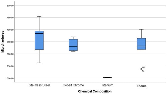 Statistical analyses were performed using IBM Statistics SPSS 26 software (Armonk, NY, USA). The level of significance was set at p-value ≤ 0.05 for all statistical analyses. The primary outcome variable of the study was Vickers hardness (HV). The appropriate alpha error was set at 0.05 and the beta error was set a 0.20. Using the data form a previous pilot study, a sample size of 30 would detect a significant difference in HV between different metallic brackets. To compare HV of metal orthodontic brackets, two normality tests, Kolmogorov–Smirnov and Shapiro–Wilk, were performed. They show that the HV values do not follow a normal pattern. Therefore, a non-parametric Kruskal–Wallis test was performed to compare the HV: