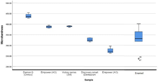 Statistical analysis showed a significant difference between the microhardness of enamel and [G] brackets (p-value = 0.003). Also, there is a significant difference in microhardness between all the SSa brackets (p value < 0.05), except between the body of the [B] brackets and the [E] brackets (p value > 0.05).