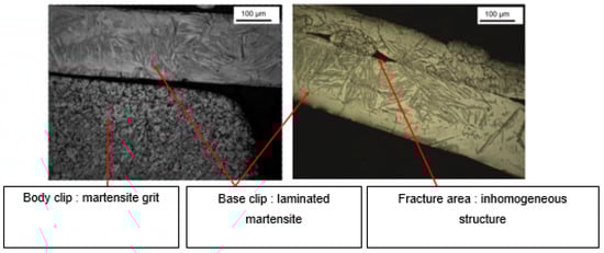 - The assembly by the welding of two structures from different production paths, which disagrees with the manufacturers’ data. According to the latter, the [E] brackets are produced by a milling method and the [B] brackets are produced by the MIM (metal-injection-molding) method, normally allowing a monolithic bracket to be obtained.