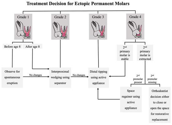 An ectopic permanent molar is defined as a local disturbance in the developing dentition []. It can present as an abnormal alteration, deviation, or drifting of the tooth eruption pathway, which results in the first or second permanent molars erupting in contact with the distal undercut of the second deciduous molar or first permanent molar, respectively, instead of erupting into the normal occlusal plane []. Nikiforuk defined ectopic eruption as a condition in which the permanent teeth, because of a deficiency of growth in the jaw or segment of the jaw, assume a path of eruption that intercepts a primary tooth, causing its premature loss and producing a consequent malposition of the permanent tooth []. Throughout the literature, the terms ectopic eruption and impaction have been used interchangeably, and this is due to the fact that an ectopically erupting tooth might present with various degrees of impaction [,,]. This can be seen in cases where the impaction (failure of eruption) of the first permanent molar takes place at the distal prominence of the second primary molar, and thus studies that have referred to the ectopic eruption as impaction were included. In this literature review, prevalence, classification, etiology and associated dentoskeletal features, diagnosis, complications and rationale for treatment, prognosis, treatment, and maintenance are discussed in detail. As the majority of the literature has focused on exploring the predictive factors and management techniques of ectopic molars, the present review intends to cover multiple aspects from previous studies to deliver a comprehensive review of ectopic permanent molars.