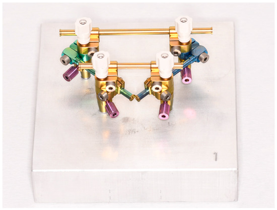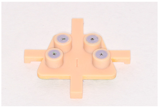 For the measurement, all casts and situations were scanned and digitized with a laboratory scanner (Arctica AutoScan and Dental Teacher; KaVo, Biberach, Germany). The scan bodies (CAM 9.S3D3.800; nt-trading) were hand-screwed onto the implant analogs of the master model first to digitize the master models. After scanning the master models, the scan bodies were placed and hand-screwed in the same alignment on the corresponding stone cast for digitalizing. The nt-VAL-Jig was mounted onto each master model. Screwed onto the master model, the nt-VAL-Jig was equipped with scan bodies on top of the fixing posts and scanned (Figure 4). The nt-VAL-Jig was removed from the transfer posts and digitized without the master model. To verify inaccuracies due to the screwing and to detect whether there could be deviations in different directions leading to exaggerated estimations of the inaccuracy of the impression or if the deviations would be masked in a similar direction, the transfer posts were left on the master model. After removing and scanning the nt-VAL-Jig, the fixing posts with scan bodies were repositioned and screwed onto the master model and scanned. The transfer and fixing posts were screwed onto the corresponding stone casts in the same alignment and were also scanned.