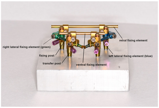 The nt-VAL-Jig was screwed onto the master models according to the manufacturer’s instruction (Figure 3). After the selection of the correct transfer posts (straight or angled) for the used implant system and implant angulation, the transfer posts were placed in the implant analogs, screwed in and hand-tightened. The angled transfer post was used to compensate for the implant divergences to such an extent that the nt-VAL-Jig could be removed. The fixing posts with the knurled screw aligned ventrally and a geometric connection were also hand-tightened to the transfer posts. The left lateral fixing element (blue) and the right lateral fixing element (green) were then pushed onto the fixing posts with the clamping screw aligned ventrally. Additionally, with the clamping screw in a ventral alignment, the long retral fixing element (yellow) and the short ventral fixing element were slid over the lateral fixing elements onto the fixing posts. All screws were fixed with a torque of approx. 10 Ncm to avoid excessive tension. In this position, the nt-VAL-Jig was scanned with Arctica AutoScan. Afterwards, the knurled screws of the fixing posts were unscrewed and the nt-Val-Jig was removed from the transfer posts.